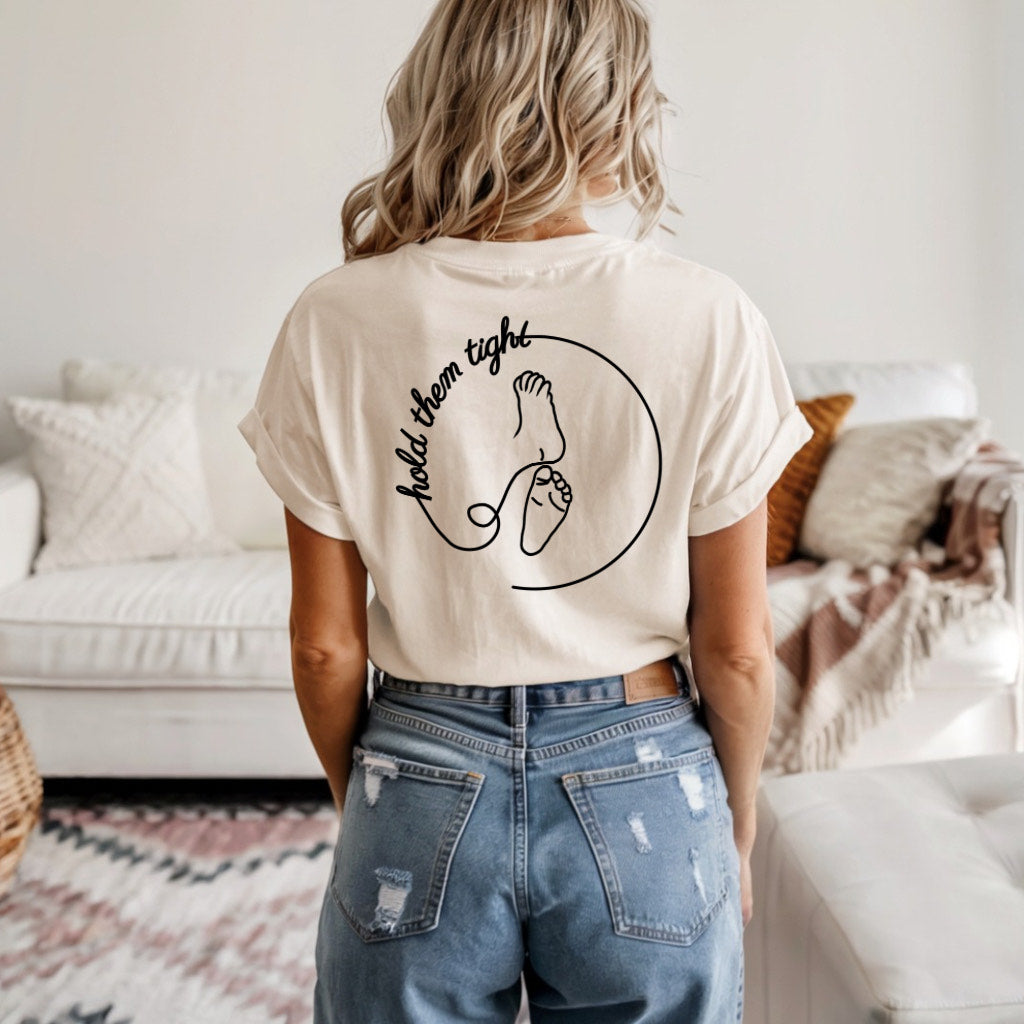 This unisex T-shirt from Hold Them Tight embraces our message with the Hold Them Tight logo on the back, and features a distinctive foot design from our sweet Elias on the front.